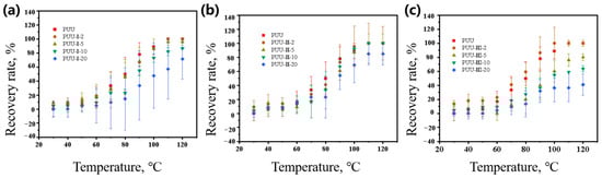 Lp is the length of shape recovery after heating, and L0 is the initial length of the sample as 25 mm. Lm is obtained by heating the sample at 120 °C for 7 min and stretching the sample to the strain of 100%. Shape recovery rates of PUU and REOC/PUU composites at different temperatures are shown in Figure 7. We can see that the shape recovery rate (Rr) of PUU after heating to 120 ℃ is close to 100%. However, with the addition of three kinds of REOC, the Rr of composite materials obviously decreases as the number of REOCs increases. Especially for PUU-III-10 and PUU-III-20, whose Rr is about 60% and 40%, respectively, the recovery performance obviously decays. It is speculated that REOC III acts as a plasticizer in composite materials, which affects the shape recovery effect of samples. However, the Rr of composites with a small amount of REOC I and REOC II is about 80%.