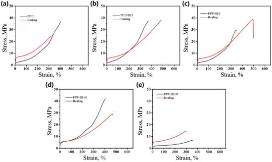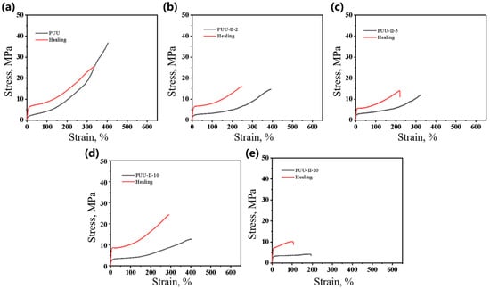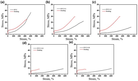 Stress–strain curves of PUU and PUU-I composite materials before and after heating and repairing at 130 °C: (a) PUU, (b) PUU-I-2, (c) PUU-I-5, (d) PUU-I-10, (e) PUU-I-20.