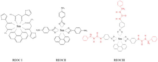 Chemical structure of REOC I (Sm(TTA)3phen), REOC II (Sm(PABA)3phen), and REOC III (Sm(BUBA)3phen).