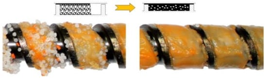 Other visual studies were performed by Pham et al. []. The results confirmed the usual view of a contiguous solid bed melting process. It was observed that the solid bed width increased with the screw rotation speed, as predicted by a classical theory. The solid bed break-up was seen at every screw speed. Conductive melting from the flight side of the solid bed was also viewed. The solid bed velocity was distinct from the screw velocity.