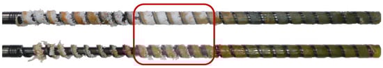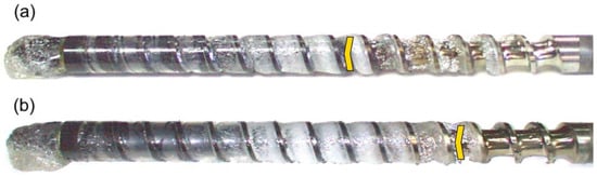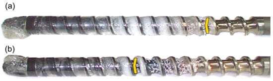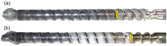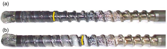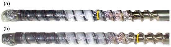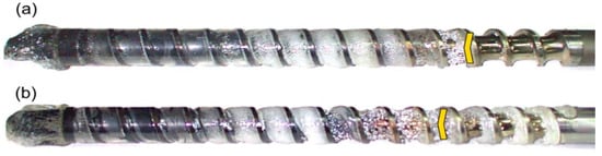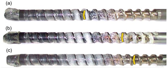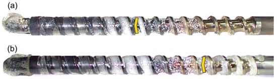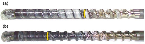 An early model of Donovan [] was based on the injection molding studies with the “screw pulling-out technique”; however, the photographs of the screws removed from the barrel were not presented. Thus, there is an obvious lack of experimental studies on the polymer flow and melting in injection molding machines showing the filling of the screw and transport mechanism, especially in the beginning sections of the screw. The reason is that it is difficult to perform such an experiment, and it is especially difficult to quickly remove the screw from the injection molding machine in order to prevent the material from melting and to maintain the structure (state) of the material corresponding to the moment of stopping the machine.
