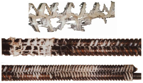 Melting in counter-rotating twin-screw extruders is much less known. The first observations were presented by Janssen []. White et al. [,] noticed that melting occurs here more rapidly than in co-rotating extruders. Wilczyński and White [] revealed the mechanism of melting in counter-rotating twin-screw extruders. They observed that melting was initiated both between the screws and at the barrel. The melting between the screws was induced by frictional work on the granules by the calendering stresses between the screws. The melting at the barrel was initiated by the barrel temperature higher than the melting point and was propagated by the viscous dissipation heating of the melt film. These observations (Figure 5) allowed us to develop models of melting in both of those regions []. Further studies of melting were reported by Wang and Min [,] as well as by Wilczyński et al. []. Based on these studies, the global models of the counter-rotating twin screw extrusion were built [,,,].