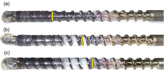 The results of the experiments are depicted in Figure 6, Figure 7, Figure 8, Figure 9, Figure 10, Figure 11, Figure 12, Figure 13, Figure 14, Figure 15, Figure 16, Figure 17, Figure 18 and Figure 19. An important observation is that in all the cases under study, the screw channel was not fully filled in the beginning section of the screw, and starvation was clearly seen. A yellow mark means the region of starving.
