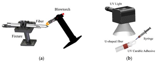 (a) Schematic of the fabrication of a U-shaped optical fiber via flame heating; (b) schematic of the UV curing and packaging process.