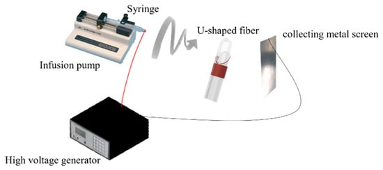 The temperature-sensing PVA layer was fabricated by electrospinning, using the following parameters: voltage: 18 kV; electrospinning solution: spinning polymer solution of 12.0 wt. % PVA; flow rate: 60 mm3/min; electrospinning distance: 200 mm; ambient temperature = 25 °C; electrospinning duration: 5, 10, and 15 min; relative humidity at 55% RH. PVA (MW 89,000–98,000, Sigma-Aldrich, Inc, St. Louis, MI, USA) fiber electrospinning was employed to coat both sides of the U-shaped optical fiber probe sensor, which was secured onto a collection plate covered with copper tape to complete the probe sensor. The experimental setup is shown in Figure 2. During electrospinning, the DC power supply provides either a positive and ground potentials. That positive electrode was connected to a hollow syringe while the ground potentials was connected to a metal screen. 18 kV DC voltage was applied to form a high-voltage electric field. The syringe was filled with electrospinning solution, and expressed at a fixed rate. The emerging PVA solution was then drawn out by the electric field into nanoscale-thickness threads to be collected on the fiber loop and metal screen. Electron microscope confocal images of PVA nanofiber coated sensor obtained were processed by using NIKON A1. The optical fiber was placed into a quartz glass tube and slightly adjusted and both ends of the fiber were fixed on a micro platform. The mold was secured onto a stage, and flame from a gas blowtorch was directed onto the loop. The diameter of the U-shape depends on the final bending radius on a micro platform to control each U-fibers. Therefore, the radius of each U-shaped fiber will be slightly different. Logically the more time the electrospinning process is on the thicker the layer that is deposited onto the collector. Figure 3 shows three individual probes, the radius of each U-shaped fiber is slightly different, so the radius of the U-shaped fiber in Figure 3 is not positively correlated with the length of time. Representative finished products are shown in Figure 3. Optical microscope (OM) images Figure 3a–c for times depended, and shows an optical microscope (OM) image Figure 3d for the bar U-shaped fiber, and SEM images Figure 3e,f are necessary to show the fiber morphology after the electrospun fibers process.