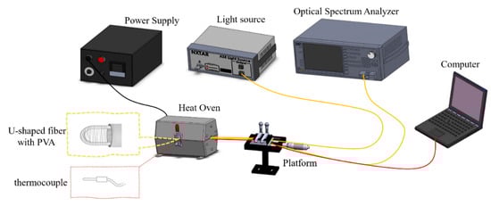 Setup for the temperature experiments. The electrospun PVA-coated sensor of the U-shaped optical fiber is connected to an ASE and an OSA and was placed into a heat oven with a k-type thermocouple.