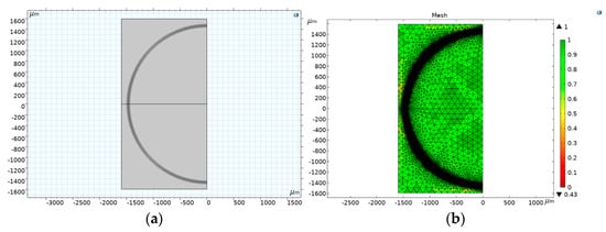 This study utilized the Wave Optics module in COMSOL Multiphysics 6.0 (Build:318, COMSOL, Inc. Burlington, VT, USA, 2022) to simulate the spectrum generated by the electrospun PVA-coated sensor on the U-shaped optical fiber. The sensor radius, measured at different electrospinning durations, was 1724 μm (after electrospinning for 5 min), 1257 μm (after 10 min), and 1494 μm (after 15 min). Then, a 2D software simulation was constructed, as shown in Figure 5a, for mesh analysis (the complete mesh contains 923,492 region elements and 32,880 boundary elements, for an average element quality of 0.9301). The mesh analysis is shown in Figure 5b. Simulations and signal analyses were then performed to generate the spectrum and electric field analysis images.