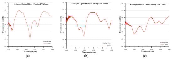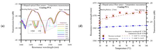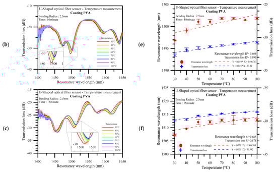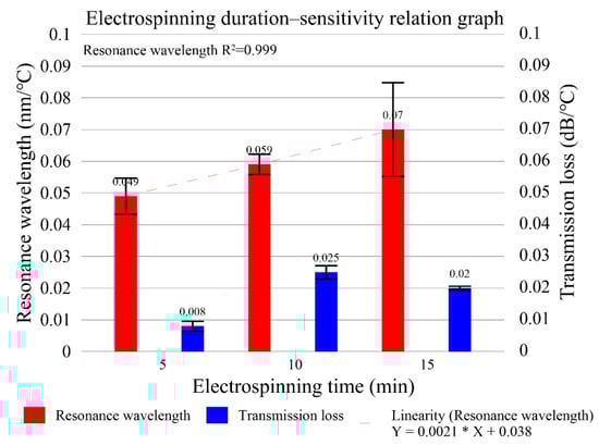 The U-shaped optical fiber sensors were tested for temperature stability in three cycles, with their spectral losses analyzed using an OSA. The results in Figure 9 show that the sensor electrospun for 5 min had a wavelength variation of 3.373 nm and a total transmission loss variation of 0.533 dB; the sensor electrospun for 10 min had a wavelength variation of 4.997 nm and a total transmission loss variation of 1.944 dB; the sensor electrospun for 15 min had a wavelength variation of 5.623 nm and a total transmission loss variation of 1.345 dB. The spectrograms clearly show that the signal peaks shift toward longer wavelengths at higher temperatures; this can be explained as due to the changes in the sensor radius from thermal expansion in the PVA (which has a coefficient of thermal expansion of 70 10−6/K). These findings are in line with the results derived from Equation (10), while the overall wavelength variation is in line with the results derived from Equation (11). The experimental results suggest that longer electrospinning durations result in thicker sensing layers and higher wavelength sensitivities, as high as 70 pm/°C. When the electrospinning time increases, the amount of PVA nanofilaments increases, and the wavelength sensitivity of the fiber also increases, which is due to the effect of the change in the radius of the U-shaped fiber. This can be determined by the transmission loss not sensitivity increases by electrospinning time increases. The greatest transmission losses in actual conditions were 1523.6 nm, 1496. 8nm, and 1450.6 nm, which were extremely similar to the simulation results. Figure 9d–f show that the average wavelength sensitivities at electrospinning durations of 5 to 15 min were 0.049 nm/°C, 0.059 dB/°C, and 0.079 nm/°C, respectively, and the mean transmission loss sensitivities were 0.008 dB/°C, 0.025 dB/°C, and 0.020 dB/°C, respectively. U-shaped optical fiber probe sensor was coated with PVA for measuring physical quantities, such as temperature and humidity. When the temperature was ample larger, the radius of the optical fiber was reduced to the point that the loop became a U shape that fits into the preset diameter. The curvature of the response is observed the linear behavior is not obeyed along with all of the temperature intervals, and linear behavior only in the initial temperature region. The measurements were compiled into the electrospinning duration–sensitivity relation graph shown in Figure 10. It can be seen that only the wavelength sensitivity increases linearly with the electrospinning duration, but not the transmission loss. The greatest increase in wavelength sensitivity was 42%, while the overall linearity of the sensor was 0.704 at maximum. These findings indicate the sensor’s excellent reliability under varying temperatures.