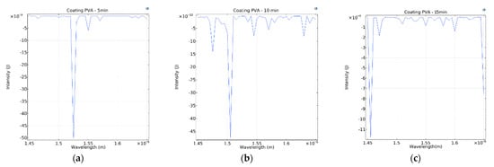 Spectra generated by the electrospun PVA-coated sensors with electrospinning durations of (a) 5 min, (b) 10 min, and (c) 15 min.