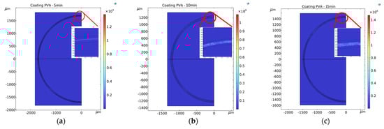 The OSA was used to measure the spectrum generated by the electrospun PVA-coated sensor of the U-shaped optical fiber. The generated spectra are shown in Figure 6. The greatest transmission losses of the sensor were at 1523.6 nm (electrospinning duration of 5 min), 1496.8 nm (10 min), and 1450.6 nm (15 min). COMSOL was used to simulate the signal variation of different sensors, which was exported as the spectrograms shown in Figure 7, where it can be seen that the greatest transmission losses of the sensor were 1525 nm (simulated using the radius of the sensor electrospun for 5 min), 1500 nm (simulated using the radius of the 10-min sensor), and 1455 nm (simulated using the radius of the 15-min sensor). Comparing Figure 6 and Figure 7, it is found that the transmission loss peaks of the actual spectrum and the simulated spectrum are very close to each other, but has few errors and the wavelength errors are 1.4 nm (5 min of electrospinning time), 3.2 nm (10 min of electrospinning time) and 4.4 nm (15 min of electrospinning time), respectively. This is due to the error, in the bending radius of the measurement sensor caused by the thickness of the electrospun wire at different electrospinning times, resulting in the simulated spectrum and the actual spectrum not being identical. The longer the electrospinning time, the more the wavelength difference caused by the thickness increases proportionally, which is in accordance with Equation (11). Figure 8 shows the simulated energy field analysis results. It can be seen that, when light enters the bending region, total reflection is no longer maintained at the core–cladding interface, and a leakage mode forms. Reflections at the interface between the cladding layer and the external medium form a WGM, and the light rays are then coupled back into the core. The two different transmission pathways result in an interference pattern that aligns with Equation (6).