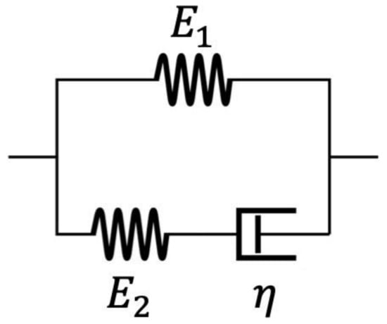 The Maxwell form of the standard linear solid model (abbreviated as the standard linear solid model in the following text), as shown in Figure 1, is a classical viscoelastic mathematical model commonly applied to analyze experimentally measured or computationally simulated viscoelastic behaviors such as stress relaxation and creep for evaluating the viscoelastic properties of materials [,,,]. Other than the standard linear solid model, there are many other types of viscoelastic models available to use, including more complicated models such as generalized Maxwell and Kelvin models [,,,,,,,,,,,,,] and fractional order models [,,,]. Nevertheless, the standard linear solid model is still one of the most common and popular viscoelastic models because of its simplicity and high applicability. The standard linear solid model has been widely applied to analyze the viscoelastic behaviors of a great variety of materials, including polymers [,,,,,,,,,,,,], single cells [,,,,], blood vessels [,], heart muscles [], cartilages [,], intervertebral discs [,], hydrogels [,,,], and various biomaterials, to name a few.
