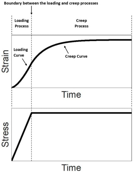 There are two sequential processes (the term “process” here can be interpreted as the action performed on the material in the test) in the creep test: loading process and creep process (Figure 3).