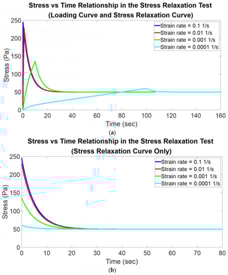 The practical method of using Equation (7) to analyze stress relaxation behavior to obtain the viscoelastic properties of materials is: Using Equation (7) to curvefit the stress relaxation curve, the values of , and can be obtained. By solving two simultaneous equations and , the values of and can be obtained. Therefore, all of the three parameters in the standard linear solid model relevant to the viscoelastic properties, , and , can be obtained. Please see Supplementary Materials File S2 for a MATLAB computer programming code for curvefitting stress relaxation curve based on using Equation (7).