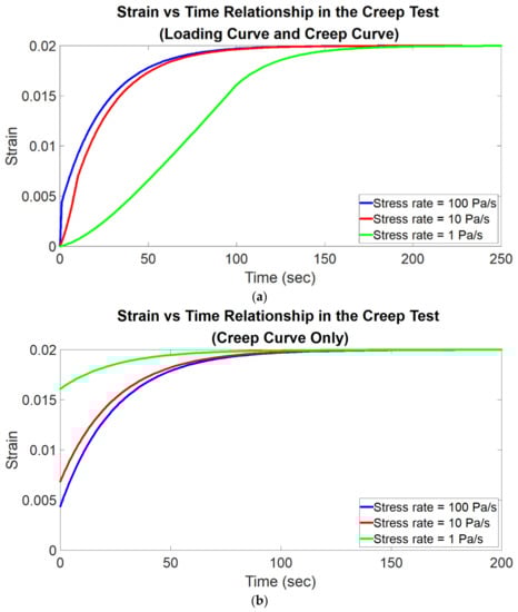 In the loading process, an external load is applied to the material with a constant stress rate from the initial state (the state in which the material has no stress and strain) until a prescribed stress value is reached. In the loading process, the strain of the material increases monotonically with time; therefore, the strain–time curve (called the loading curve) is a monotonically increasing curve (Figure 3). The stress of the material increases linearly with time since the stress rate is constant.