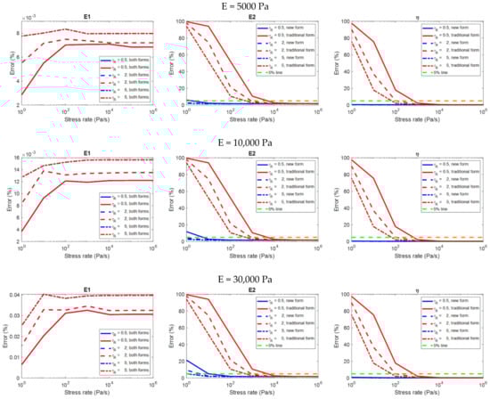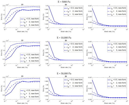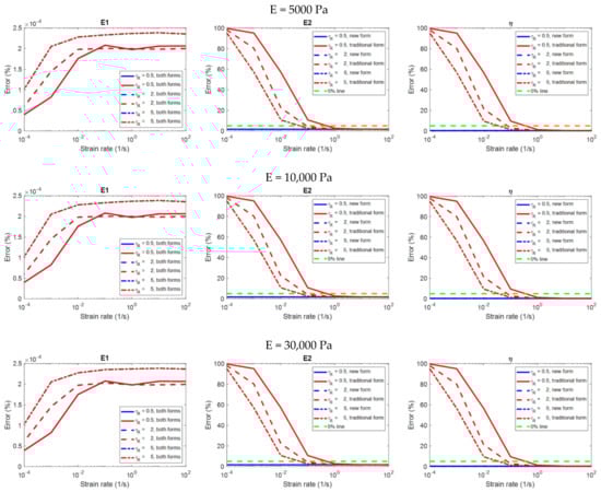 If the error is less than 5%, the evaluation is considered to be accurate. The error margin of 5% is chosen in our analyses because it is an error margin commonly used in various fields of scientific research according to literatures [,,,,,,,]. For each viscoelastic property (, and ), the relationship between the strain rate and the error analyzed by each equation form is investigated.