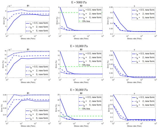 Figure 8 shows the relationship between the stress rate and the error in the evaluation of the viscoelastic properties on different material models analyzed using the two equation forms. Figure 9 only shows the results analyzed using the constitutive equation derived with a finite loading rate in order to highlight the details. Please remember that the evaluation is considered to be accurate if the error is less than 5%. Some observations on the analysis results that are more relevant to practical applications are summarized below: