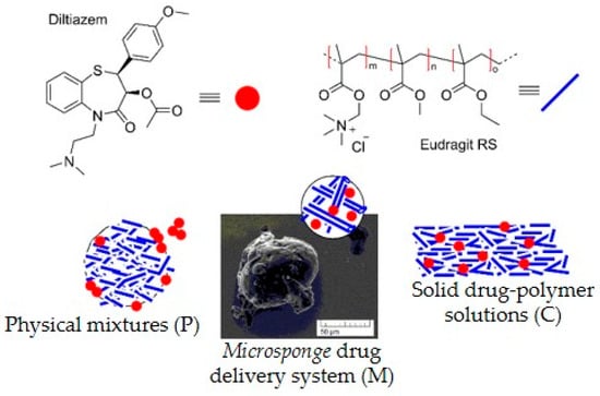 In our previous works we presented the synthesis and physicochemical, functional, and biopharmaceutical characterization of diltiazem-loaded Eudragit RS microsponges [,]–a highly preferable drug-carrier system in solid as well as in semisolid dosage forms [,]. The microsponges were designated to serve as a controlled delivery system in diltiazem 2% rectal hydrogels. The method used for their preparation (quasi-emulsion solvent diffusion method) belongs to the precipitation- and solvent-evaporation techniques []. To further extend the structural knowledge of the particles obtained, we herein suggest complex FTIR and sorption studies on the microporous matrix-typed microsponges along with two control (reference) models: physical drug–polymer mixtures and homogeneous solid drug–polymer dispersions, obtained by a casting approach (Figure 1). The morphological, elemental, and functional peculiarities of the drug-delivery system in question are additionally investigated by applying SEM-EDX and DSC.