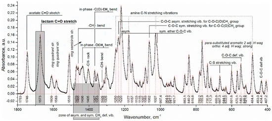 In the progress of our observations, we found out that the proposed ATR-FTIR method acquires satisfactory performance (with the required high analytical sensitivity and specificity) in a relatively narrow wavenumber range of about 50 cm−1 (from 1700 to 1650 cm−1) (Figure 3). Similarly, in many other circumstances, it has been assumed relevant to track out the changes in the carbonyl frequency (νCO) region when carbonyl-bearing drug molecules are examined [,,].