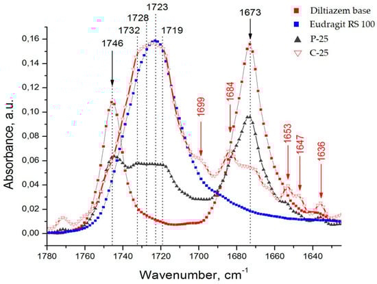 Diltiazem shows two highly characteristic, well-defined, and readily recognizable C=O stretching bands with relatively high intensity in the range of 1760–1660 cm−1 (Figure 2 and Figure 3). The band observed at 1746 cm−1 is assigned to the CO group of the acetate functional, and that positioned at lower frequencies (with a maximum at 1673 cm–1) is assigned to the CO functional group of the seven-membered lactam ring []. In the same spectral interval, however, the presence of a very intense and broad IR band (with a max. at 1723 cm−1) in the spectrum of the polymer Eudragit RS 100 was also registered (Figure 3). Certainly, this last-mentioned absorption band should be considered as consisting of at least three overlapping bands corresponding to the three different kinds of grafted carbonyl (ester) groups on the polymeric backbone (Figure 1). According to the generally accepted theory of infrared spectroscopy, however, when solvent–solute mixtures of two or more constituents are examined (as in the case here studied), considerable frequency shifts of all carbonyl groups due to mutual interference effects are expected to appear. Usually, the used solvent (a liquid of low-molecular-weight organic substance) or a high-molecular organic matrix (polymer) affects both the position and the intensity of each absorption band of the examined solute (diltiazem) via the so-called solvent effect. Indeed, when the spectra of diltiazem–Eudragit RS physical mixtures (P) and solid solutions (C) were analyzed, considerable differences in the CO frequency pattern of each participant from its native spectrum were registered (Figure 3).