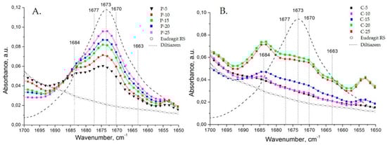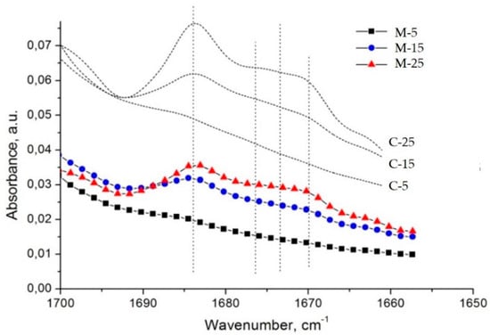 Concerning the spectra of diltiazem–Eudragit RS solid solutions (C models), significant changes in the considered wavenumber range were registered. The appearance of several new bands was observed for all concentrations examined (Figure 4B and Figure 6). Each of the newly appearing bands may be assigned to a complex intermolecular interaction between the two constituents, diltiazem and Eudragit RS. The good mutual solubility between them was illustrated and confirmed by the appearance of three new bands in the C=O stretching region (at 1663, 1670/1671, and 1684 cm−1) and by the reduction in the intensity of the absorption band at 1673 cm−1. Nonetheless, the spectral patterns of the highly dispersed mixtures (C probes) were considered too complex for a clear identification to be made. Still, it is reasonable to assume that during the process of homogeneous dispersion, the drug molecules occupy regions of the polymeric matrix with different degree of crystallinity, and to a certain extent dielectricity, which produce detectable frequency variations in νCO of the drug solute.