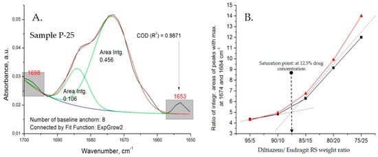 Deconvolution analysis in the C=O (lactamic) stretching vibrations range for physical drug–polymer mixtures (P models); (A) an example for deconvolution analysis carried on Sample P-25 spectrum (the same analysis is carried for all other samples-Table A1, Table A2, Table A3, Table A4, Table A5, Table A6, Table A7, Table A8, Table A9 and Table A10, Appendix A) and (B) determination of drug-saturation point of the polymer matrix by the physical-mixing approach; the curve in red presents optimized processing of the deconvolution analysis data, in which the cause for the low regression coefficient (R2)–a peak at 1653 cm−1, is not taken into account.