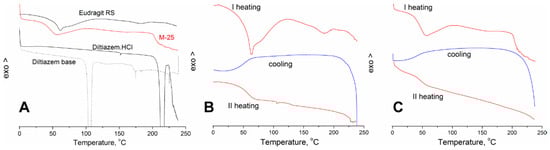 Figure 9A shows the thermograms obtained via the heating-only mode for diltiazem (base), diltiazem hydrochloride, Eudragit RS 100, and M-25 sample. Diltiazem base was demonstrated to melt at 103.8 °C, which is in agreement with the literature data (105–107 °C) []. From the same figure, we detected a melting point at 214.5 °C for the hydrochloride salt, which again corresponds well to the literature []. The melting of diltiazem hydrochloride (~225 °C) is accompanied by decomposition, which becomes apparent above 230 °C []. Two peaks, at 63.1 and 183.6 °C, appear in the thermogram of the pure Eudragit RS 100 polymer. The first is the glass transition, which is reported to occur between 61.9 and 64.9 °C []. The high temperature peak (183.6 °C) is due to Eudragit RS 100 melting, which is known to occur at ~187 °C [].