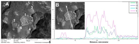 SEM-EDX technique was applied to identify the elemental composition along a cut made on paraffin-embedded particles from the M-25 formulation. The primary morphological characteristics are shown in Figure 10A. On the micrograph obtained, we distinguished and marked three zones, namely (1) clear cuts/slices of microsponge particles (#1 and #2); (2) intact microsponge particles (#3, #4, and #5); and (3) paraffin base (surrounding the visible particles). The white arrow on Figure 10B shows exactly where an EDX scan analysis was performed. In the same figure, the dynamics of the elemental composition (for S, N, O, and Cl) along the cut can be followed.