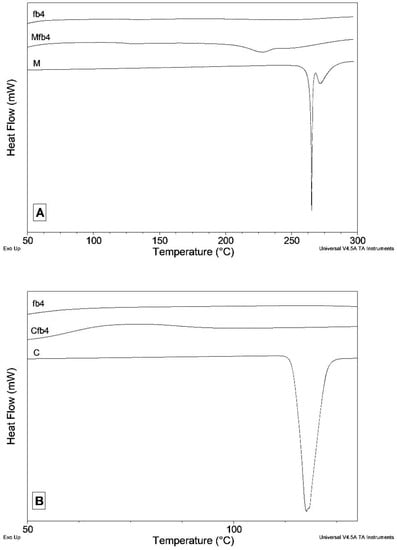 DSC curves of meloxicam, fb4 and Mfb4 (A) and carvedilol, fb4 and Cfb4 (B).