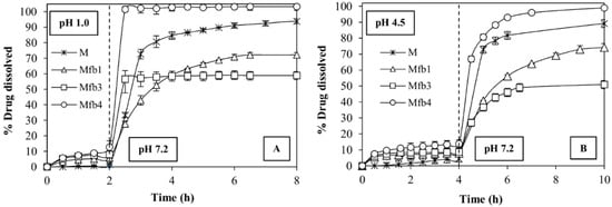 Dissolution profiles of M, and drug-loaded fibers obtained by HPMC-AS 716 (Mfb1), HPMC-AS912 (Mfb3), and by combining HPMC-AS912 and HPMC K100LV (Mfb4) in two different pH change methods: pH 1.0 for 2 h and then pH 7.2 (A) and pH 4.5 for 4 h and then pH 7.2 (B). All samples contain a dose of 7.5 mg of M.