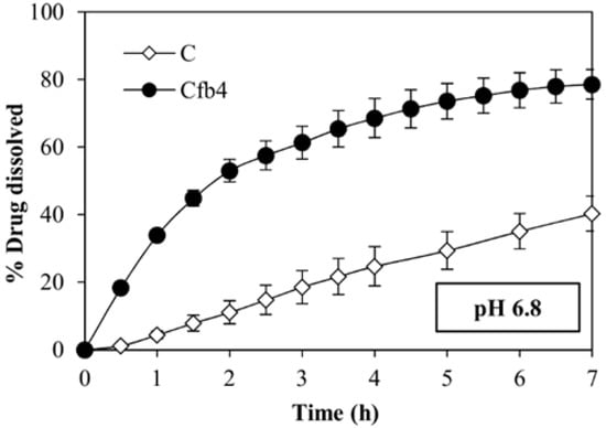The same polymeric combination (HPMC-AS912 + HPMC K100LV) was able to enhance the dissolution rate of C and Cfb4 in pH 6.8 buffer compared to the drug alone, which is much less soluble at this pH (Figure 6).