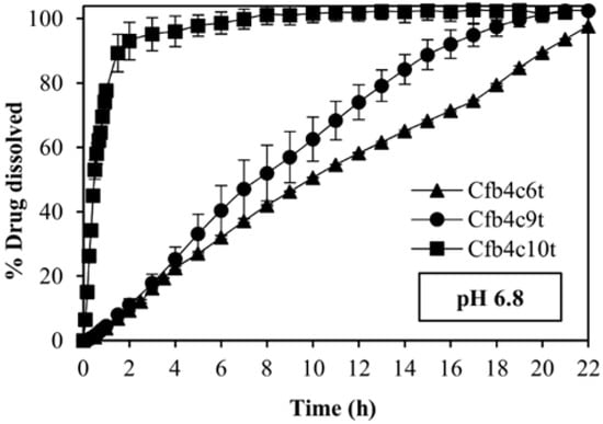 Cfb4c6t and Cfb4c9t allow reaching a sustained release of C, showing a td 90% of 20 h and 15 h respectively. Instead, Cfb4c10t allows achieving a fast drug release, reaching a td 90% in 1.5 h. (Figure 10).