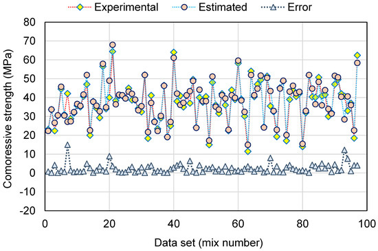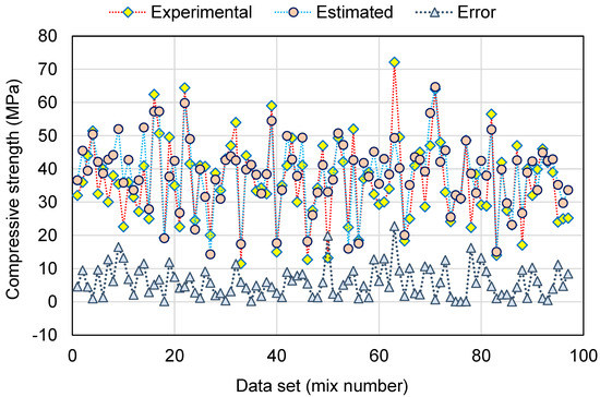 Figure 10 and Figure 11 illustrate a contrast of the MLPNN model’s experimental and anticipated results. Figure 10 exemplifies the relationship among experimental and projected outcomes, with an R2 of 0.81 suggesting that the MLPNN model is more specific than the SVM model in estimating the GeoPC C-S. Figure 11 illustrates the distribution of experimental, estimated, and error values for the MLPNN model. The variation between experimental and estimated values was found to be between 0.06 and 22.77 MPa, with an average of 5.86 MPa. Additionally, the variation from the experimental results was lower than 1 MPa for 10 mixes, between 1 and 3 MPa for 25 mixes, between 3 and 6 MPa for 23 mixes, and greater than 6 MPa for 39 mixes. This also indicates a greater divergence of the MLPNN model’s predicted outcomes when compared to the experimental results. Therefore, the MLPNN technique is also less accurate at predicting GeoPC’s C-S, but slightly more accurate than the SVM model.