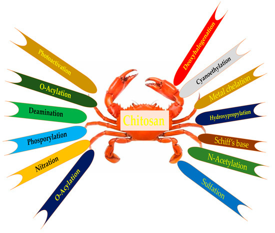 Overview of various chemical modification processes that go into the making of chitosan derivatives.