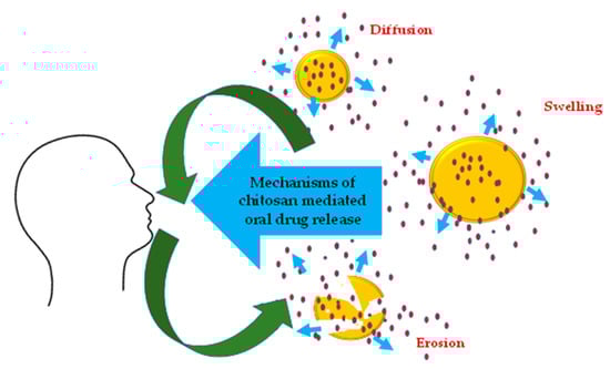 When drugs are administered orally, they must be able to survive various ranges of pH and gastrointestinal tract (GIT) secretions. The very process of oral drug absorption rests on transport (via passive diffusion, carrier-mediated transport, or pinocytosis) across the GIT membrane. This is impacted by various GIT physiological. The oral mucosa has a thin epithelium and rich vascularity, which is makes it ideally fit for buccal and sublingual administration [39]. The release of drugs from chitosan and its derivatives follows the conventional protocol that holds good for chitosan. Drug release is influenced by the hydrophilicity of chitosan and pH of the swelling solution. The chitosan-drug release mechanism involves swelling, diffusion of drugs through the polymeric matrix and polymer erosion [40] (Figure 2).