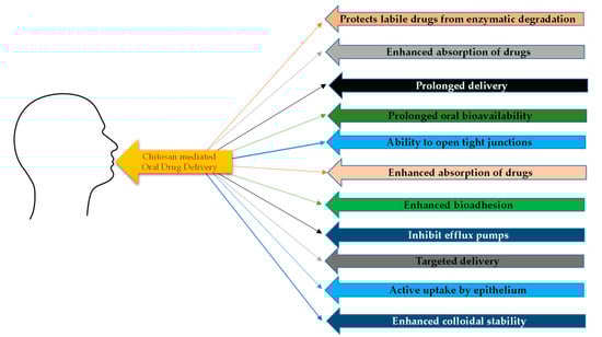 Figure 3 lists the limitations that chitosan and its derivatives have broken, when it can to oral drug delivery. Drug delivery via the oral route is the easiest and e most convenient for patients. Chitosan because of its mucoadhesive nature, is able to protect labile drugs from GIT enzymatic degradation. Additionally, it is able to enhance absorption of administered therapeutic agent without affecting the biological system. This makes chitosan a valuable candidate as an oral delivery agent. Not only chitosan, but also chitosan micro-/nanoparticles have been demonstrated for oral drug delivery. Intestinal disinfection, suppression of Helicobacter pylori and dealing with ulcerative colitis, have been accomplished following treatment with antibiotic loaded chitosan particles. Amoxicillin and clarithromycin loaded into chitosan particles inhibited H. pylori [41,42]. The mucoadhesive properties of chitosan enabled prolonged delivery and oral bioavailability of acyclovir, an antiviral agent. This was because acyclovir chitosan microspheres could enhance drug retention in the upper GIT [43]. Protection against GIT degradation, improvement of oral bioavailability of insulin and enhancement of bioadhesion, have been reported as a result of its encapsulation into chitosan microspheres [44].