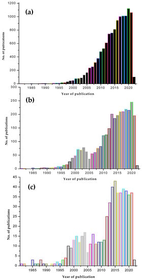 Comparative bar diagrams of research articles published in the area of (a) chitosans and drug delivery (b) chitosan derivatives and drug delivery (c) chitosan derivatives for oral drug delivery, based on our pubmed search.