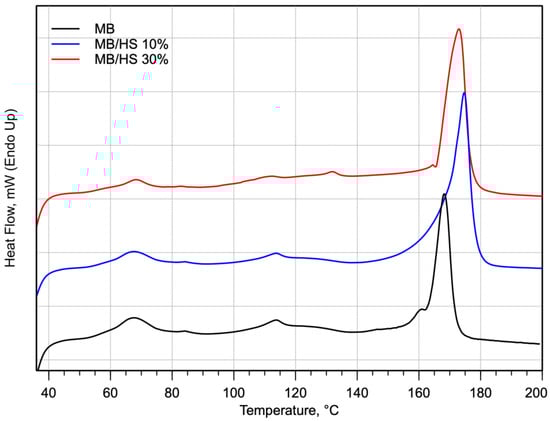 DSC scans of MB and biocomposites were carried out in order to characterize the thermal properties of these developed materials. The DSC curves of the biocomposites with regard to the matrix are shown in Figure 4, and the DSC parameters are summarized in Table 2.