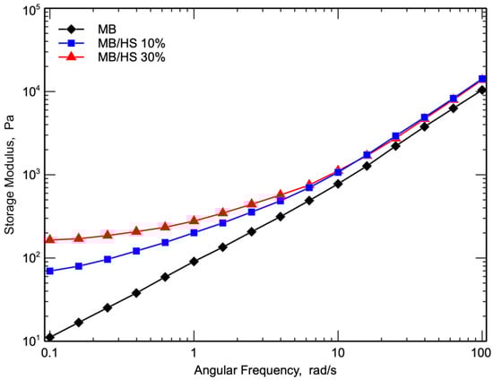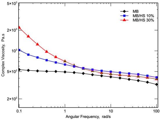 In Figure 5, the flow curves of MB and MB/HS biocomposites as a function of angular frequency are reported. The viscosity curves clearly show that HS significantly affected the response of the biocomposites. In particular, the flow curves of the biocomposites do not show any Newtonian plateau at a low frequency, and typical shear-thinning [40] behavior with the viscosity dramatically increasing with decreasing the frequency was observed. Moreover, the flow curves of the biocomposites showed a more pronounced non-Newtonian behavior. Because of their higher viscosity, the non-Newtonian behavior of the biocomposites was more pronounced with an increased content of filler and increased frequency. The flow curves of the two biocomposites are very similar; because of its more pronounced non-Newtonian behavior, the viscosity of the biocomposite with 30% HS became lower than that of the biocomposite with a lower content of HS.