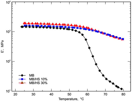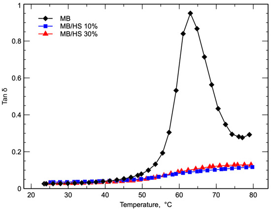 It was observed that the E′ of the biocomposites increased when increasing the content of HS throughout the investigated temperature range because of the higher stiffness due to the presence of the hard inert filler. In more detail, MB, MB/HS 10%, and MB/HS 30% showed storage modulus values of 1454, 1596, and 1898 MPa, respectively, at room temperature.
