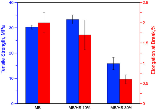 The effects of HS on tensile strength and elongation at break are shown in Figure 9. The presence of HS led to an increase in the tensile strength of the MB/HS 10% sample by about 10% compared with that of MB. On the contrary, MB/HS 30% showed a decrease in tensile strength of about 48% compared with that of MB.