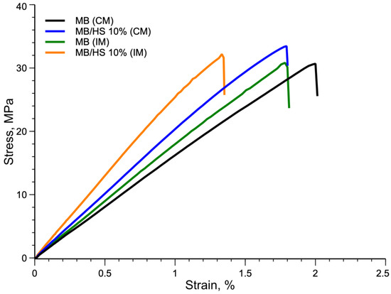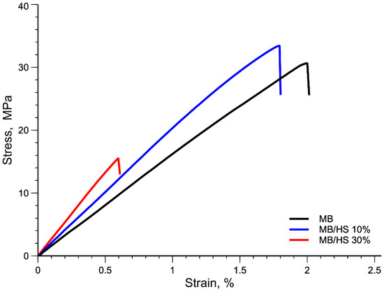 This decrease in tensile strength of the MB/HS 30% sample may be associated with premature failure of the samples; see Figure 10.