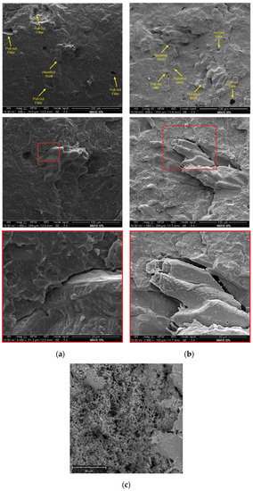Figure 11 shows the SEM micrographs of the fracture surfaces of the two biocomposite materials. The first feature observed was that many particles were pulled out of the matrix, leaving small holes. In addition, the lack of a strong interaction between the HS and the MB matrix was clearly observable, suggesting poor adhesion at the particle–polymer interface.