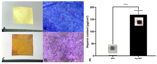 Macroscopical observation presented a significant difference between the BPS (Figure 1A) and HepBPS (Figure 1C), in which HepBPS adopted a diffuse brown appearance. After incubation with the TBO solution, the BPS sample obtained a light blue color (Figure 1B), whereas a homogeneous presence of purple crystals was clearly detected on the HepBPS sample (Figure 1D). This result indicated a successful deposition of heparin on the scaffold using the LbL assemble technique. Quantitatively, heparin content in the HepPBS was determined as 169.5 ± 17.31 mg/cm2 (Figure 1E).