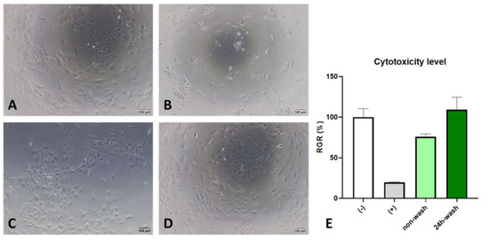 Observation of HUVEC cultured in different solutions. (A)—Culture medium as a negative control. (B)—Liquid extract from latex as a positive control. (C)—Liquid extract from a non-washed HepBPS. (D)—Liquid extract from HepBPS after 24 h wash in PBS 1X. (E) Cytotoxicity determination (Magnification 10×). All scale bars are 100 µm.