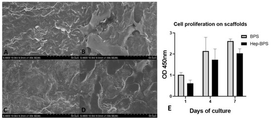 Assessment of cell attachment by SEM and cell proliferation on scaffolds. (A)—BPS without cell seeding. (B)—BPS seeded with HUVEC. (C)—HepBPS without cell seeding. (D)—HepBPS seeded with HUVEC. (E)—CCK8 assay for cell proliferation. All scale bars represent 50 μm.