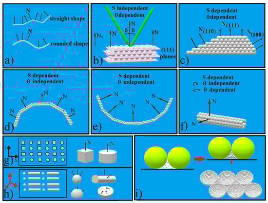 However, the definition of θ in Equation (1) hides a very important parameter which could strongly modify the light diffraction in colloidal crystals: the crystal’s shape. In the case of simple three-dimensional figures, there are two classes of shapes: straight shapes, such as, rectangular, cubic, pyramidal, truncated pyramid, and prisms of all kinds which have faces and edges as attributes; and curved shapes, such as, spherical, hemispherical, cylindrical, conical, or toroidal which possess some specific attributes such as curvature and focus. One of the most important geometrical features which differentiates these shapes is the normal direction N, in each point of the surface (Figure 1a). For a straight shape, the normal directions on a facet have the same orientation which suddenly changes at the edge of a neighbor facet, while a round shape continuously changes the orientation of its normal direction; thus, they intersect in the center of the curvature. At a half of the distance between this point and the pole of the curved surface we find the focal point; a high level of optical phenomena (physical optics) are described through the focal point. Straight shaped crystals which present facets that are non-parallel with the substrate have their one normal direction different to that of the substrate and can introduce specific optical features. This geometry is known as asymmetrical Bragg diffraction [29]. Further, the curved shaped surfaces can induce beside wave (physical) optics and geometrical (ray) optics phenomena. For an easier management of surface phenomena, the substrate normal is usually taken as a reference and the measurements are reported to the substrate normal; thus, many times, the normal to the colloidal crystal is considered as the normal to the substrate. However, this is correct only for one kind of shaped colloidal crystal that is flat and parallel to the substrate surfaces.