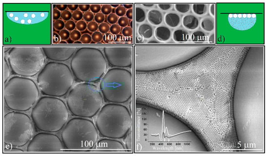 The main quality of the “Hanging drop” method of colloidal crystals synthesis [60] (Figure 2a) is the formation of high thickness CCs. However, we noticed that it can also form a monolayer of micrometric-sized PS spheres if a dilute colloidal solution (0.5–1.0% w/v) is used. The lack of frictional forces between the spheres and the substrate (the colloidal crystal film is formed at the liquid/air interface) [60] and the favorable orientation of gravity [60] result in a monolayer with large-ordered domains (tens of spheres) (Figure 2b). Due to the relatively large voids between the micrometric spheres, a molecular solution (Na2SiO3) infiltrates easily and after calcination a quality inverse opal results (Figure 2c). However, a colloidal solution of sub-micron spheres must not only homogeneously and completely infiltrate the opal, but also form a CC that is crystalized and structurally resistant to heat treatment.