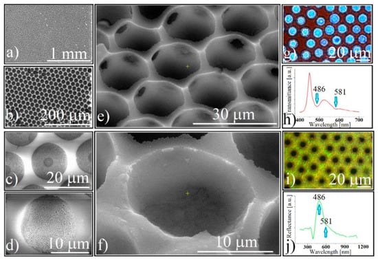 Direct SEM images of: (a) large view of silica-ordered concavity array; (b) silica-ordered concavity array honeycomb-like structure; (c) silica-ordered concavity synthesized by a sequential approach; (d) silica-ordered concavity synthesized by co-assembly; (e,f) tilted (45°) SEM images of silica-ordered concavities; (g) transmission optical microscopy image of 0.264 μm silica spheres forming ordered concavities; (h) transmittance of 0.264 μm silica spheres forming ordered concavities; (i) reflection optical microscopy image of 0.264 μm silica spheres forming ordered concavities; (j) reflectance of 0.264 μm silica spheres forming ordered concavities.