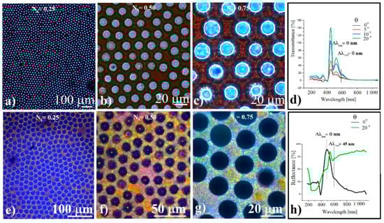 However, taking optical microscopy images at various successive magnifications (Figure 4a–c, e–g), we noticed the existence of some light diffraction rings in the peripheral part of each concavity when an objective with a certain numerical aperture (NA = 0.50) was used. These diffraction rings are more intense in transmitted light (Figure 4b) and less intense in reflected light (Figure 4f). Angle-resolved UV-Vis spectrometry shows no dip displacement in transmitted light (Figure 4d) and a possible displacement of the band generated by the family of planes (111), as well as a stagnation of the band generated by the planes (200) in reflected light (Figure 4h) when the angle of incidence is varied from 0 degrees to 20 degrees (a characteristic of curved colloidal crystal [38,39,40,41,42,43]). However, this displacement is uncertain in the absence of the deconvolution of the reflectance spectra and of other complementary investigations, and it could explain the difference of the rings’ intensity (transmission and reflection), rather than their existence.