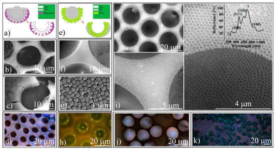 However, though their quality is low and both the Na2SiO3 and the TiO2 precursor produce structures with many defects, they still generate the Bragg diffraction of light (Figure 5d). These extensive defects are due to the incomplete infiltration of precursor solutions, heat treatment inducing the shrinking phenomenon associated with multiple cracking generation, as well as the inherent appearance of an overlayer, a frequent phenomenon that also occurs in the case of classical rectangular block opals and is difficult to cancel. However, during the experiments we noticed the possibility of obtaining polystyrene inverse-opals where the infiltrated material between the silica spheres derives from the large polystyrene spheres via melt infiltration from inside the film, as suggested in Figure 5e. We found that an array of PS and silica spheres (such as the one in Figure 2) that are kept in the oven at a temperature at which the polystyrene becomes liquid turn into an array of cavities with polystyrene that is completely infiltrated among the silica spheres (Figure 5f–h). High quality inverse opals resulted from the dissolution of the silica spheres with aqueous HF (Figure 5i). Through these structures the light can be transmitted (Figure 5j) or reflected (Figure 5k). Reflection spectrometry performed on such inverted opals (inset Figure 5i) reveals the existence of five band gaps placed at: λ1 = 420 nm, λ2 = 475 nm, λ3 = 590 nm, λ4 = 684 nm, and λ5 = 856 nm. By using Equations (1) and (2) for: m = 1; D = 264 nm; f = 0.74; n1 = 1 (air refractive index); n2 = 1.55 (polystyrene refractive index); and θ = 0 we can identify the planes family of an fcc lattice that is responsible for the existence of the following: λ1 (calculated) = 426 nm and corresponds to the (200) planes family; λ2 (calculated) = 491 nm and corresponds to the (111) planes family; λ3 (calculated) = 602 nm and corresponds to the (110) planes family; and λ5 (calculated) = 851 nm and corresponds to the (100) planes family. We failed to attribute a theoretical Bragg band gap correspondence for λ4 = 684 nm.